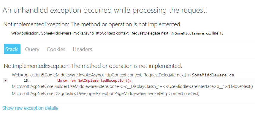 // Startup.csusing Microsoft.AspNetCore.Builder;using Microsoft.AspNetCore.Hosting;using Microsoft.AspNetCore.Http;using Microsoft.Extensions.DependencyInjection;using System;namespace WebApplication1{ public class Startup {public void ConfigureServices(IServiceCollection services){}public void Configure(IApplicationBuilder app, IHostingEnvironment env){ if (env.IsDevelopment()) {app.UseDeveloperExceptionPage(); } // 使用匿名函數(shù)實(shí)現(xiàn)一個(gè)內(nèi)聯(lián)中間件 app.Use(async (context, next) => {throw new NotImplementedException("一個(gè)使用匿名函數(shù),但未實(shí)現(xiàn)具體內(nèi)容的內(nèi)聯(lián)中間件"); }); app.Run(async (context) => {await context.Response.WriteAsync("Hello World!"); });} }}這里我們?cè)?app.Run 之前使用 app.Use 添加一個(gè)匿名函數(shù)實(shí)現(xiàn)的內(nèi)聯(lián)中間件,按照中間件的注冊(cè)順序,當(dāng)發(fā)起請(qǐng)求時(shí),會(huì)拋出一個(gè)異常 NotImplementedException("一個(gè)使用匿名函數(shù),但未實(shí)現(xiàn)具體內(nèi)容的內(nèi)聯(lián)中間件")