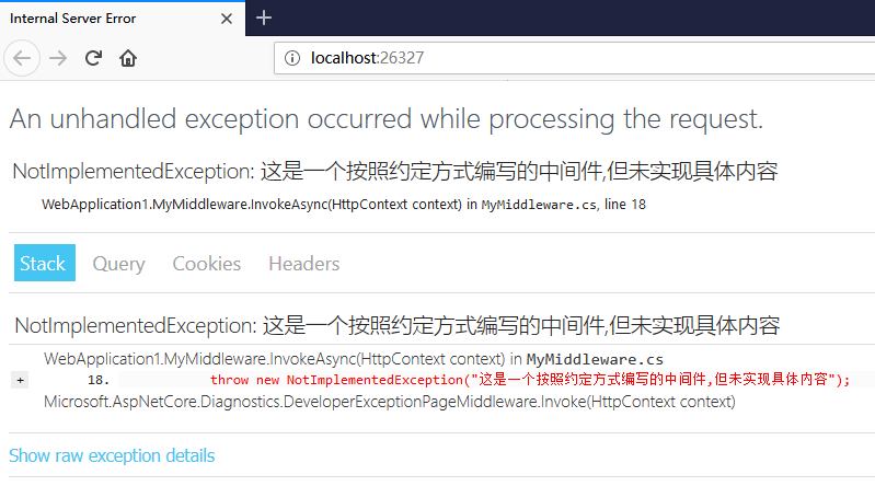 // 新建類(lèi) MyMiddleware.csusing Microsoft.AspNetCore.Http;using System;using System.Collections.Generic;using System.Linq;using System.Threading.Tasks;namespace WebApplication1{ public class MyMiddleware : IMiddleware {public Task InvokeAsync(HttpContext context, RequestDelegate next){ throw new NotImplementedException();} }}按照上面實(shí)現(xiàn)的中間件 MyMiddleware,在執(zhí)行時(shí)應(yīng)該會(huì)拋出 NotImplementedException.