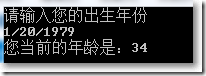 class Program {static void Main(string[] args){ try {Console.WriteLine("請輸入您的出生年份");DateTime d = Convert.ToDateTime(Console.ReadLine());DateTime dateInstance = new DateTime();int age = dateInstance.Age(d);Console.WriteLine("您當(dāng)前的年齡是:{0}", age);Console.ReadKey(); } catch (Exception ex) {Console.WriteLine(ex.Message); }} }