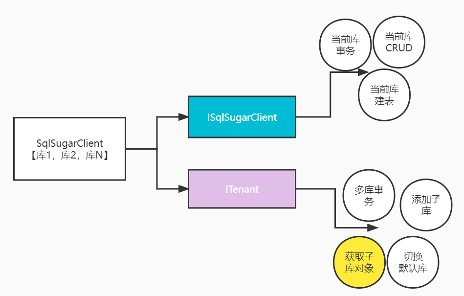 var db = new SqlSugarClient(new List<ConnectionConfig>(){ new ConnectionConfig(){ConfigId="0",DbType=DbType.SqlServer,ConnectionString=..,IsAutoCloseConnection=true}, new ConnectionConfig(){ConfigId="1",DbType=DbType.MySql,ConnectionString=..,IsAutoCloseConnection=true }}); if(!db.IsAnyConnection(configId))//當前上下文不存在則添加 db.AddConnection(new ConnectionConfig{ DbType = DbType.SqlServer,ConfigId = "1",IsAutoCloseConnection = true,ConnectionString = 。。 });//開啟事務try { //db我們稱為主Db db.BeginTran(); //開啟多庫 (db.Ado.BeginTran是單庫事務)事務支持單庫和多庫 db.GetConnection("1").Insertable(new Order()//var childDb=db.GetConnection(1);我們稱為子DB,子DB不具有租戶方法,具有單當庫操作方法 { CreateTime = DateTime.Now, CustomId = 1, Name = "a", Price = 1 }).ExecuteCommand(); db.GetConnection("2").Insertable(new Order() { CreateTime = DateTime.Now, CustomId = 1, Name = "a", Price = 1 }).ExecuteCommand(); //提交事務 db.CommitTran(); }catch(Exception ex){ //回滾事務 db.Rollback();}多庫架構可以在底層做到兼容,比如事務不需要引用外部DLL,比如我可以讓底層語法支持多庫,像EF CORE你能改他的