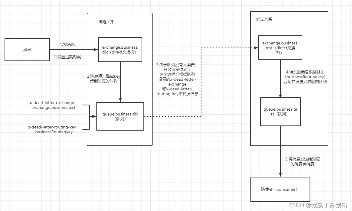 實現需要創建兩對交換機和隊列,其中需要對其中一對的隊列進行設置x-dead-letter-exchange和x-dead-letter-routing-key屬性,屬性指定轉發到另一對的交換機,