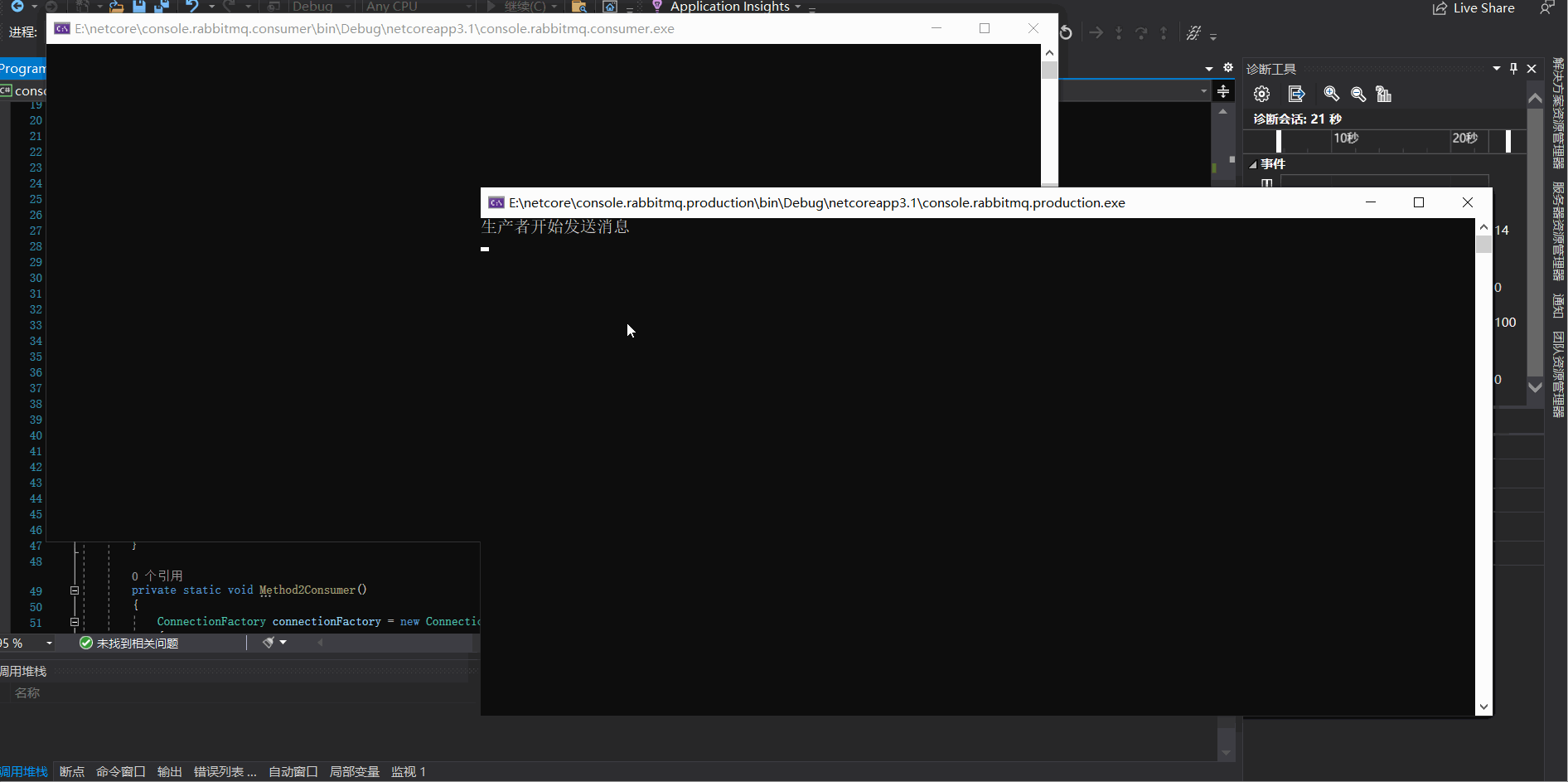 ConnectionFactory connectionFactory = new ConnectionFactory {UserName = "guest",Password = "guest",HostName = "127.0.0.1" }; //創建連接 var connection = connectionFactory.CreateConnection(); var channel = connection.CreateModel(); EventingBasicConsumer consumer = new EventingBasicConsumer(channel); //給消費時添加一個委托 consumer.Received += (obj, ea) => {var message = Encoding.UTF8.GetString(ea.Body.ToArray());//打印消費的消息Console.WriteLine(message);channel.BasicAck(ea.DeliveryTag, false); }; //消費queue.business.test隊列的消息 channel.BasicConsume("queue.business.test", false, consumer); Console.ReadKey(); channel.Dispose(); connection.Close();實現效果: