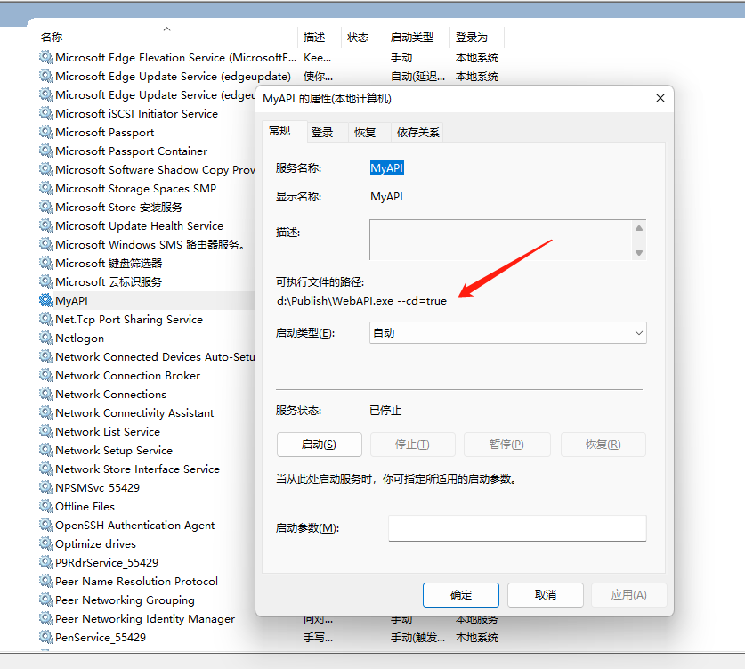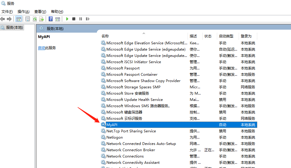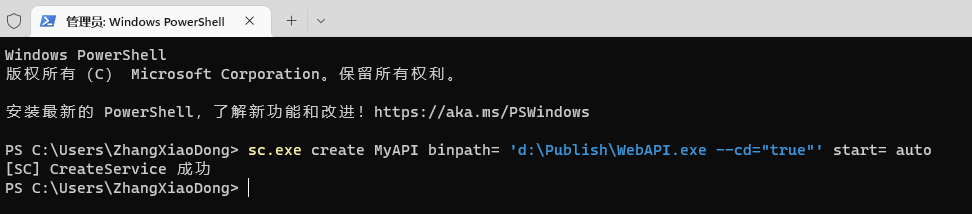 安裝成功之后控制臺會輸出[SC] CreateService 成功 ,其中MyAPI 時我們創建服務時指定的服務名稱,binpath 即是我們的程序路徑,注意 true 是 用英文狀態的雙引號包裹,然后整個 binpath 采用因為狀態的 單引號包裹,start= auto 則表示將我們的 MyAPI 服務設置為自動啟動。