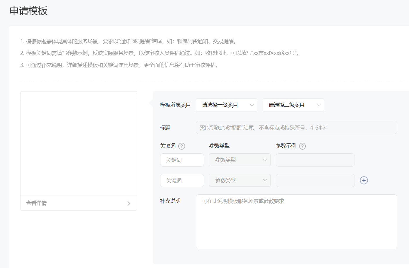 1、其實微信小程序的訂閱消息和公眾號的訂閱消息模板還是比較好申請的。如果在類目模板與歷史模板中無法找到合適自己的模板,那么自己申請一個模板。審核的話,2-3天就可以收到通知了。需要注意的是,申請模板的時候,最好把各項在本地保留一份。因為一旦提交申請,在公眾號或小程序后臺,你就找不到了。玩意審核沒通過,再申請的時候,前面寫的啥內容,已經忘的差不多了!