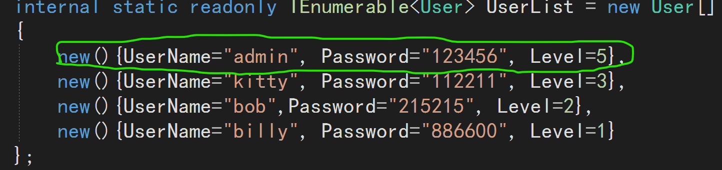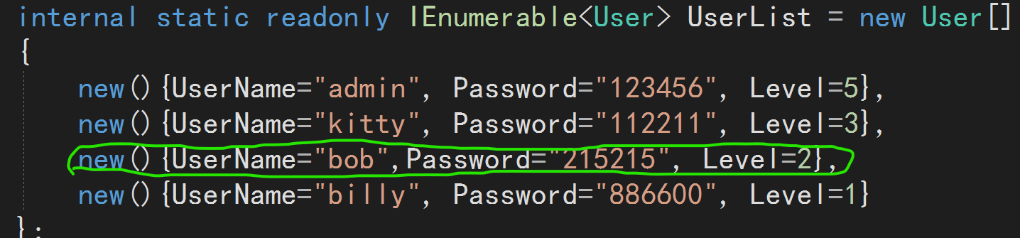 public static class UserDatas{ internal static readonly IEnumerable<User> UserList = new User[] {new(){UserName="admin", Password="123456", Level=5},new(){UserName="kitty", Password="112211", Level=3},new(){UserName="bob",Password="215215", Level=2},new(){UserName="billy", Password="886600", Level=1} }; // 獲取所有用戶 public static IEnumerable<User> GetUsers() => UserList; // 根據用戶名和密碼校對后返回的用戶實體 public static User? CheckUser(string username, string passwd) {return UserList.FirstOrDefault(u => u.UserName!.Equals(username, StringComparison.OrdinalIgnoreCase) && u.Password == passwd); }}這樣的功能,對于咱們今天要說的內容,已經夠用了。