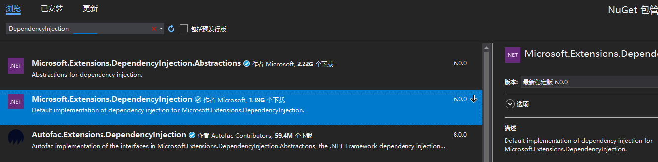 我們首先用代碼來看什么是DI,在.net提供的擴展包Microsoft.Extensions.DependencyInjection中來完成DI,nuget安裝。
