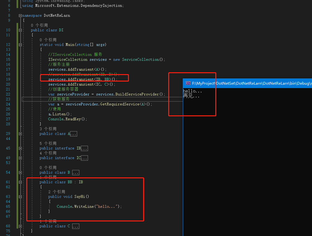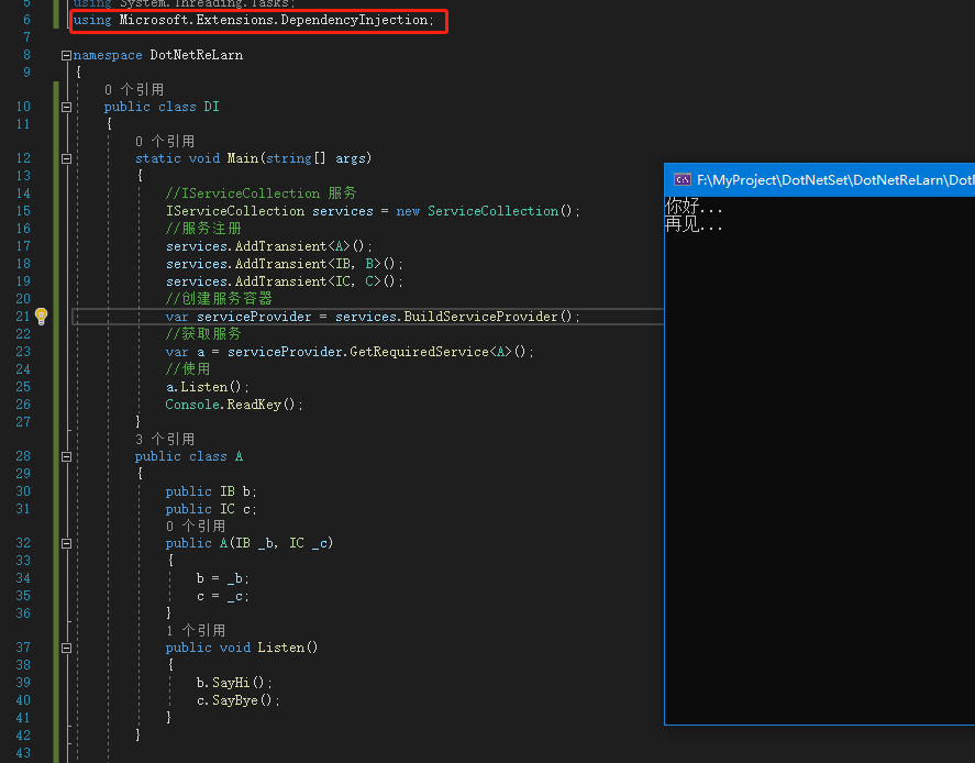 //IServiceCollection 服務 IServiceCollection services = new ServiceCollection(); //服務注冊 services.AddTransient<A>(); services.AddTransient<IB, B>(); services.AddTransient<IC, C>(); //創建服務容器 var serviceProvider = services.BuildServiceProvider(); //獲取服務 var a = serviceProvider.GetRequiredService<A>(); //使用 a.Listen(); Console.ReadKey();