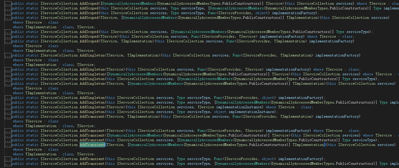 在注冊服務的時候我使用的AddTransient方法,表示注冊的服務是瞬態的,也就是每次請求都是重新創建實例。同時還提供其它注冊服務的方法。