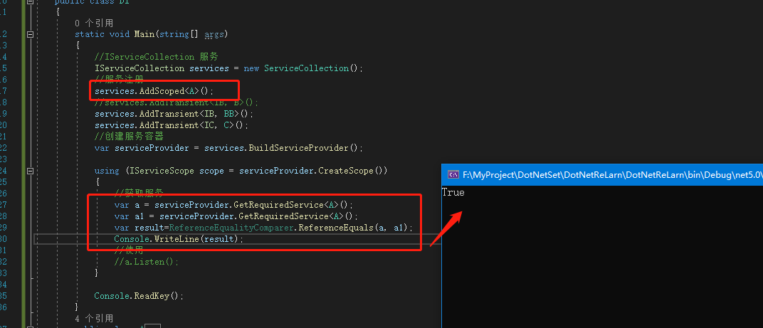 我們使用AddScoped添加對象,然后在作用域中取兩個A對象進行比較,可以看到是True。