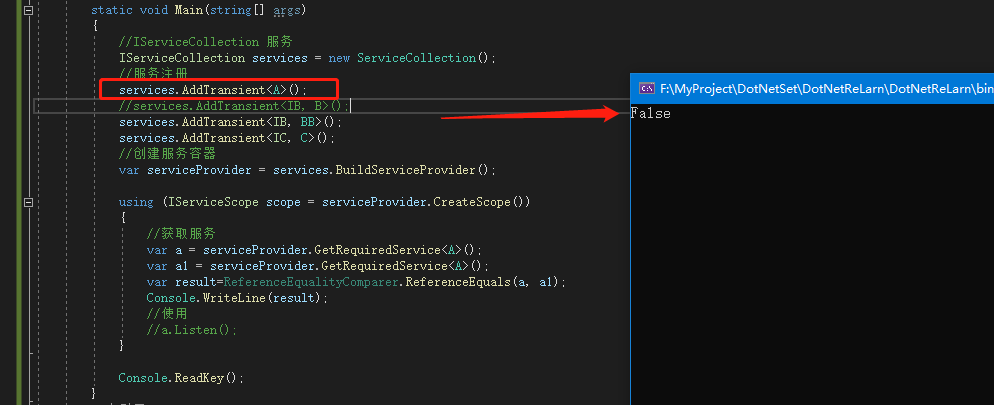 如果我們用AddTransient注冊A,即使在作用域內兩個對象比較也是不一樣的,結果為False。