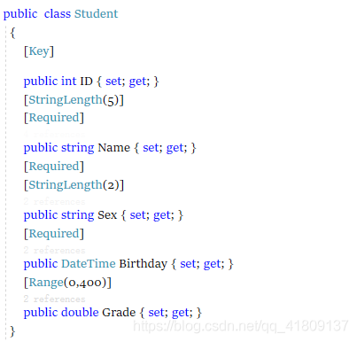 在.net中是保留字,所以我們?yōu)榘嗉?jí)類起名“SysClass”,但是“Class”在數(shù)據(jù)庫中不是保留字多以我們可以怎樣做在“SysClass”類上打上特性**[Table(“Class”)]**,然后在其他字段上添加幾個(gè)必要的屬性,“SysClass”的Students屬性上有個(gè)virtual,指明這個(gè)是外鍵。