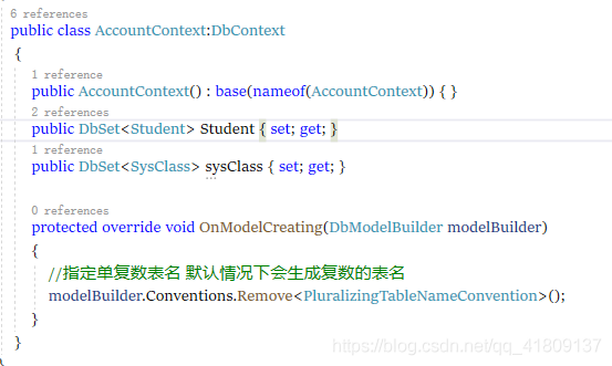 實(shí)現(xiàn)父類的構(gòu)造函數(shù),傳入的參數(shù)是nameof(AccountContext),指明的是使用哪個(gè)的數(shù)據(jù)庫的連接串,OnModelCreating()這個(gè)方法可以重寫也可以不重寫,這個(gè)方法主要是為了指明是否需要在將代碼映射到數(shù)據(jù)庫時(shí),是否生成復(fù)數(shù)的表名,默認(rèn)情況下是自動(dòng)生成復(fù)數(shù)的表名。