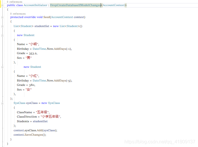 然后在新建一個(gè)“AccountInitialzer”類,用來初始化數(shù)據(jù)庫的,他繼承自“DropCreateDatabaseIfModelChanges”,表明是當(dāng)實(shí)體改變時(shí),刪除數(shù)據(jù)庫中的表,然后在根據(jù)代碼映射的實(shí)體新建數(shù)據(jù)庫中的表,然后重寫它的Seed方法,