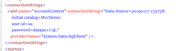 最后我們開始配置數(shù)據(jù)庫的連接串 name 指的是數(shù)據(jù)庫連接串的名字 也是我們“AccountContext”的類傳入的參數(shù), initial catalog 是創(chuàng)建的數(shù)據(jù)庫的名字,我們這里不指明創(chuàng)建的數(shù)據(jù)庫的位置,當(dāng)然也可以指明創(chuàng)建的數(shù)據(jù)庫位置,不指明的他會(huì)在你數(shù)據(jù)庫的文件夾中創(chuàng)建新的數(shù)據(jù)庫,還有就是 providerName=“System.Data.SqlClient” 這個(gè)一定要帶上,否則可能會(huì)出錯(cuò)。