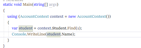 然后我們?cè)诳刂婆_(tái)繼續(xù)敲代碼,這里的Using語法,說明一下我們對(duì)DBcontext這個(gè)類查看定義發(fā)現(xiàn),這個(gè)類是實(shí)現(xiàn)了IDisposable接口,這就意味著,它是可以被釋放的托管資源,避免內(nèi)存越占越多,造成的程序性能的較低,同時(shí)這也是一個(gè)好的編程習(xí)慣。