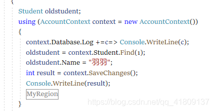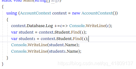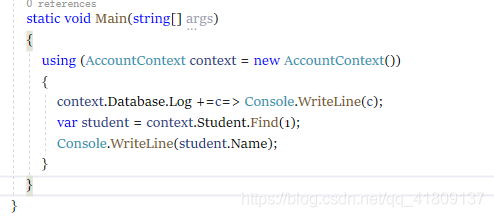 我們重新改造一下控制臺(tái)的代碼,添加 context.Database.Log +=c=> Console.WriteLine©; 這句話會(huì)幫我們記錄數(shù)據(jù)的日志。