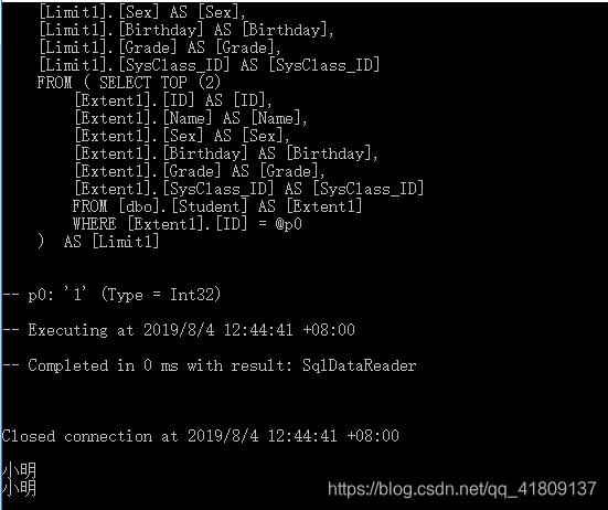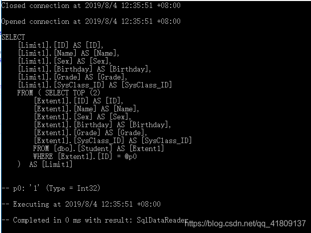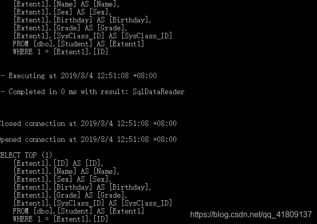 我們執(zhí)行查詢操作 發(fā)現(xiàn)控制臺(tái)多了許多代碼,這就是數(shù)據(jù)庫的日志,當(dāng)然,我們看到的這條sql語句,就是我們執(zhí)行 var student = context.Student.Find(1); 這句話時(shí),生成的sql語句,是不是用起來很方便,但是我們只需要查詢主鍵是1的數(shù)據(jù),他卻給我們生成了這么長(zhǎng)的一條sql語句,是不是看起來感覺EF其實(shí)也笨笨的,所以這就是EF不適合大型項(xiàng)目的原因。