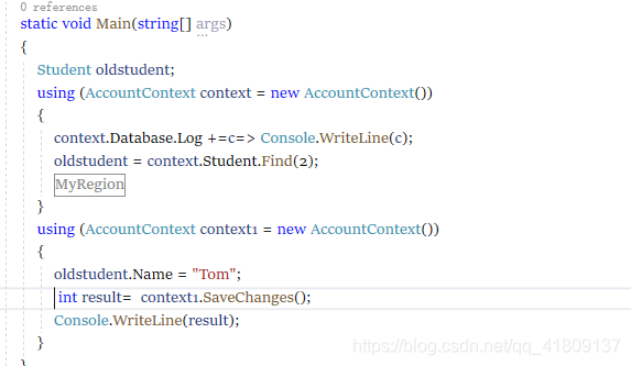 這里就要說明一下了,這里我們使用的是兩個(gè)AccountContext對(duì)象,context對(duì)象查詢出了學(xué)生student,context對(duì)象便開始監(jiān)管這個(gè)對(duì)象,我們用context1這個(gè)對(duì)象修改是,因?yàn)閏ontext1這個(gè)對(duì)象,根本就不知道student是誰,當(dāng)然會(huì)修改失敗了。