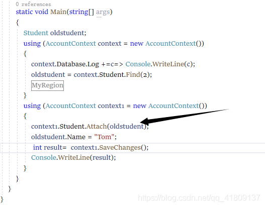需要注意的是如果被修改的對(duì)象的屬性在Attach之前,會(huì)修改失敗的,因?yàn)槟菚r(shí)候,context1還沒有對(duì)student進(jìn)行監(jiān)管。