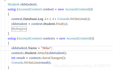 Attach是將查出來的student讓context1進(jìn)行監(jiān)管,就相當(dāng)于與這個(gè)student對(duì)象是被context1查出來的一樣,但也是有區(qū)別的,所以我們就修改成功了。