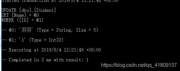 我們先查詢一個(gè)學(xué)生,然后在修改它的Name屬性,然后保存,這里result返回的是0,意思是沒有執(zhí)行成功,我們查看數(shù)據(jù)庫發(fā)現(xiàn)確實(shí)沒有修改成功。