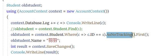 我們?cè)诓樵兊降臄?shù)據(jù)中添加AsNoTracking()的方法,再次修改實(shí)體,發(fā)現(xiàn)修改失敗了,這里解釋一下AsNoTracking()這個(gè)方法,他表示不再追蹤這條數(shù)據(jù),也就是context這個(gè)對(duì)象不再監(jiān)管oldstudent這個(gè)對(duì)象,所以會(huì)修改失敗的,雖然一定程度上可以提高性能,但是介意不要使用。