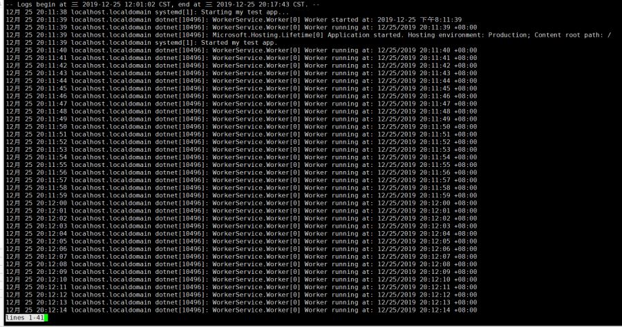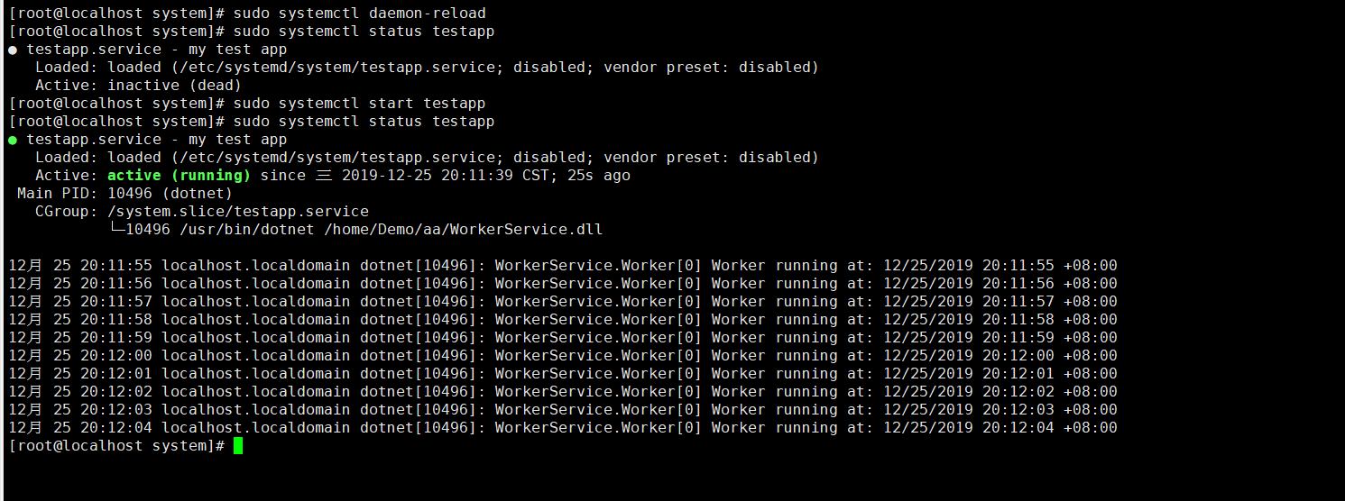 [Unit]Description= my test app[Service]Type=notifyExecStart=/usr/bin/dotnet /home/demo/WorkerService.dll[Install]WantedBy=multi-user.target