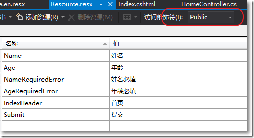 創建有關英文的資源文件,也把訪問修飾符設置為public:
