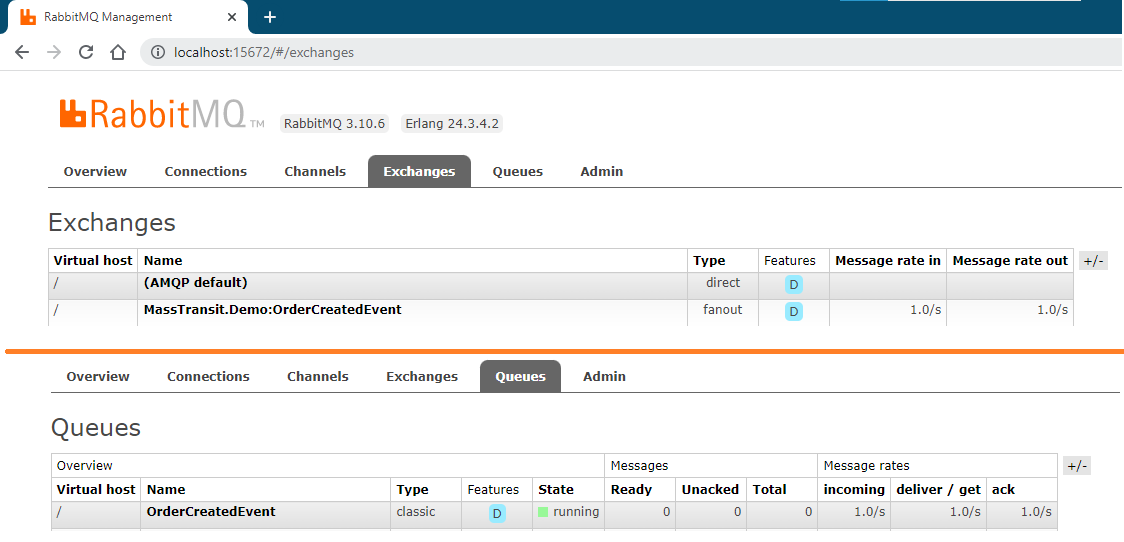 using MassTransit;using MassTransit.Demo;IHost host = Host.CreateDefaultBuilder(args) .ConfigureServices(services => {services.AddHostedService<Worker>();services.AddMassTransit(configurator =>{ configurator.AddConsumer<OrderCreatedEventConsumer>(); // configurator.UsingInMemory((context, cfg) => // { // cfg.ConfigureEndpoints(context); // }); configurator.UsingRabbitMq((context, cfg) => {cfg.Host( host: "localhost", port: 5672, virtualHost: "/", configure: hostConfig => {hostConfig.Username("guest");hostConfig.Password("guest"); });cfg.ConfigureEndpoints(context); });}); }) .Build();await host.RunAsync();運(yùn)行項(xiàng)目,MassTransit會自動在指定的RabbitMQ上創(chuàng)建一個類型為fanout的MassTransit.Demo.OrderCreatedEventExchange和一個與OrderCreatedEvent同名的隊(duì)列進(jìn)行消息傳輸,如下圖所示。
