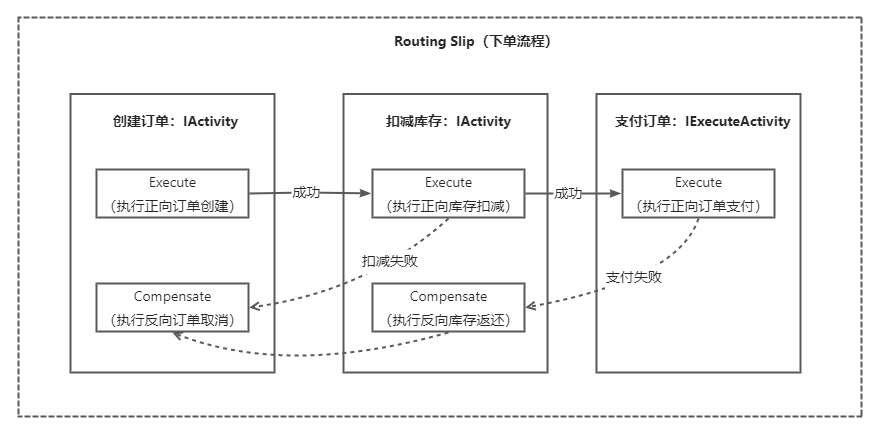 而對于IActivity和RoutingSlip則是MassTransit Courier的核心對象,主要用于實(shí)現(xiàn)Saga模式的分布式事務(wù)。MassTransit Courier 實(shí)現(xiàn)了Routing Slip模式,通過按需有序組合一系列的Activity,得到一個用來限定消息處理順序的Routing Slip。而每個Activity的具體抽象就是IActivity和IExecuteActivity。二者的差別在于IActivity定義了Execute和Compensate兩個方法,而IExecuteActivitiy僅定義了Execute方法。其中Execute代表正向操作,Compensate代表反向補(bǔ)償操作。用一個簡單的下單流程:創(chuàng)建訂單->扣減庫存->支付訂單舉例而言,其示意圖如下所示。而對于具體實(shí)現(xiàn),可參閱文章:AspNetCore&MassTransit Courier實(shí)現(xiàn)分布式事務(wù)