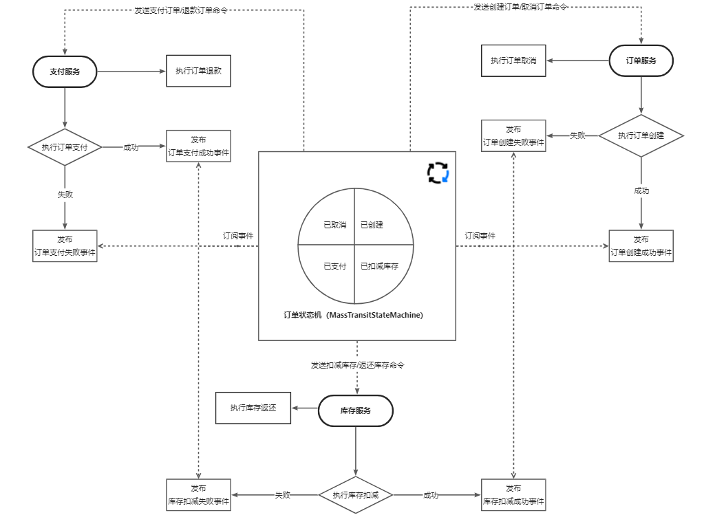 從上圖可知,通過MassTransitStateMachine可以將事件的執(zhí)行順序邏輯編排在一個集中的狀態(tài)機(jī)中,通過發(fā)送命令和訂閱事件來推動狀態(tài)流轉(zhuǎn),而這也正是Saga編排模式的實(shí)現(xiàn)。