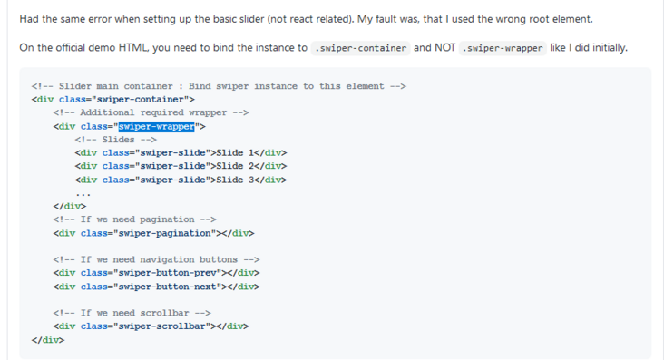 所以我覺得,外面的類名可以修改,但是wrapper類名不可以修改,因?yàn)槟慵词垢牧送饷娴念惷捎谀阃ㄟ^refs拿到外面這個(gè)container了,然后初始化了Swiper,Swiper內(nèi)部還是覺得你這樣的處理是對的。外面這個(gè)container我覺得主要是用來初始化用的,類名無需保留,這個(gè)和我看中文的swiper文檔寫的不一樣,它說要保留,可能目的就是為了讓用戶遵守它的規(guī)定,防止報(bào)錯(cuò)吧。: