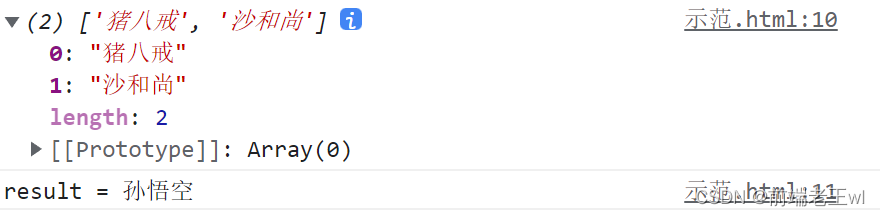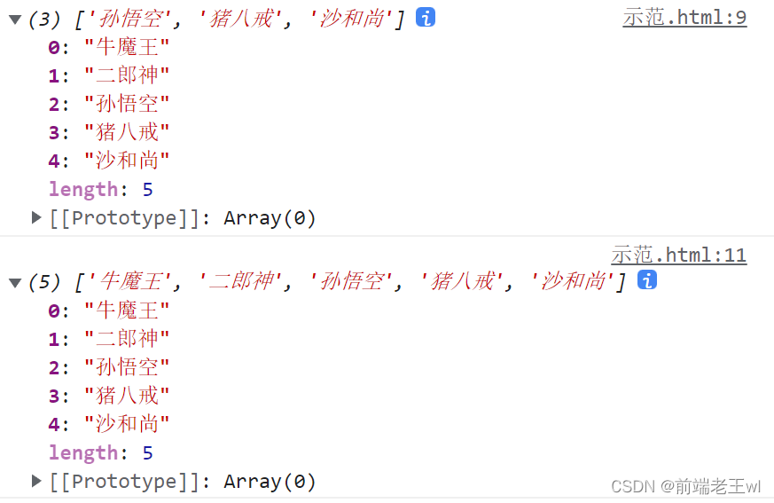 var arr = ["孫悟空", "豬八戒", "沙和尚"];console.log(arr);arr.unshift("牛魔王", "二郎神");console.log(arr);