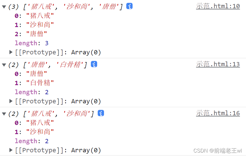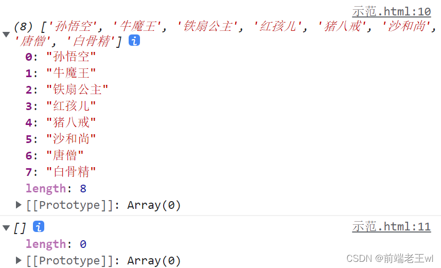 var arr = ["孫悟空", "豬八戒", "沙和尚", "唐僧", "白骨精"];var result = arr.splice(1, 0, "牛魔王", "鐵扇公主", "紅孩兒");console.log(arr);console.log(result);