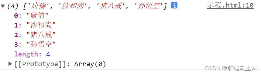 var arr = ["孫悟空", "豬八戒", "沙和尚"];var result = arr.push("唐僧", "蜘蛛精", "白骨精", "玉兔精");console.log(arr);console.log("result = " + result);