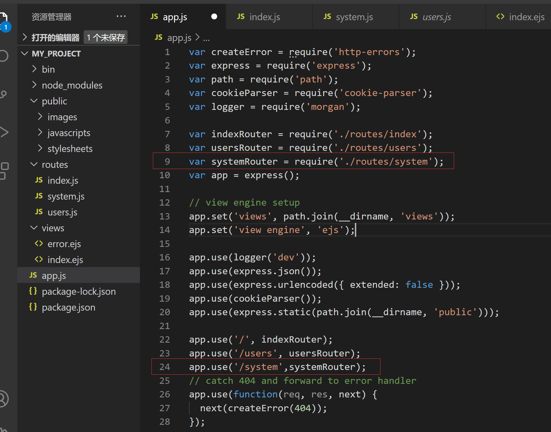 注:在app.js中第9行引入我們的system.js模塊,第24行,將這個(gè)模塊注冊在/system路徑上。