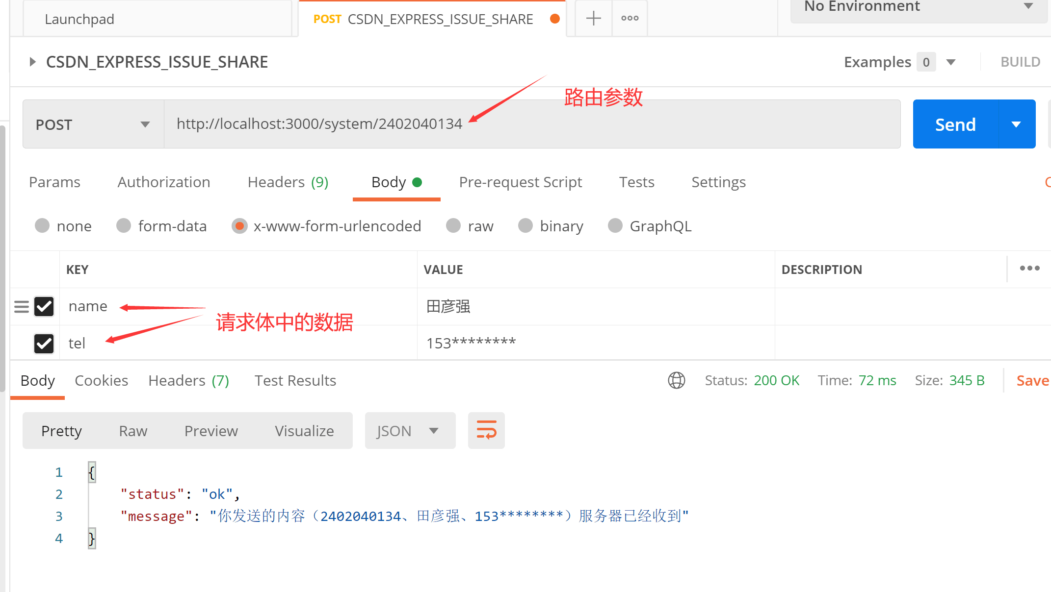 注意,在上圖中url中的2402040134即路由參數(shù),下方的name和tel是post的請求body內(nèi)容。最后,可以看到,返回了我們預(yù)期的json內(nèi)容。