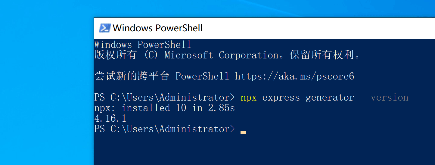 看到下圖中的返回信息,就表明時這個生成器在nodejs中已經存在且工作正常了。(對的,你沒猜錯,node已經把express的生成器當成了自己的一部分)