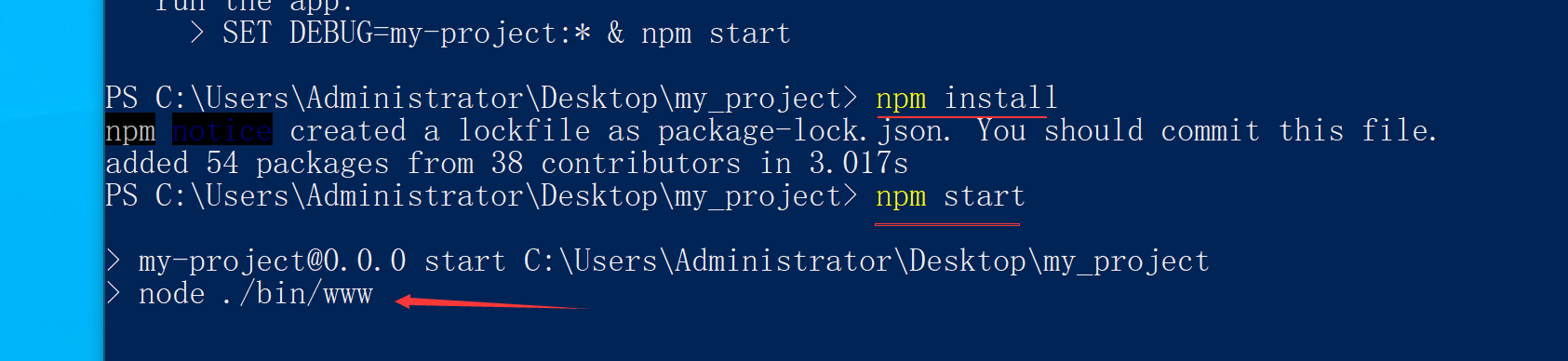 npx: installed 10 in 2.999s create : public\ create : public\javascripts\ create : public\images\ create : public\stylesheets\ create : public\stylesheets\style.css create : routes\ create : routes\index.js create : routes\users.js create : views\ create : views\error.ejs create : views\index.ejs create : app.js create : package.json create : bin\ create : bin\www install dependencies: > npm install run the app: > SET DEBUG=my-project:* & npm start