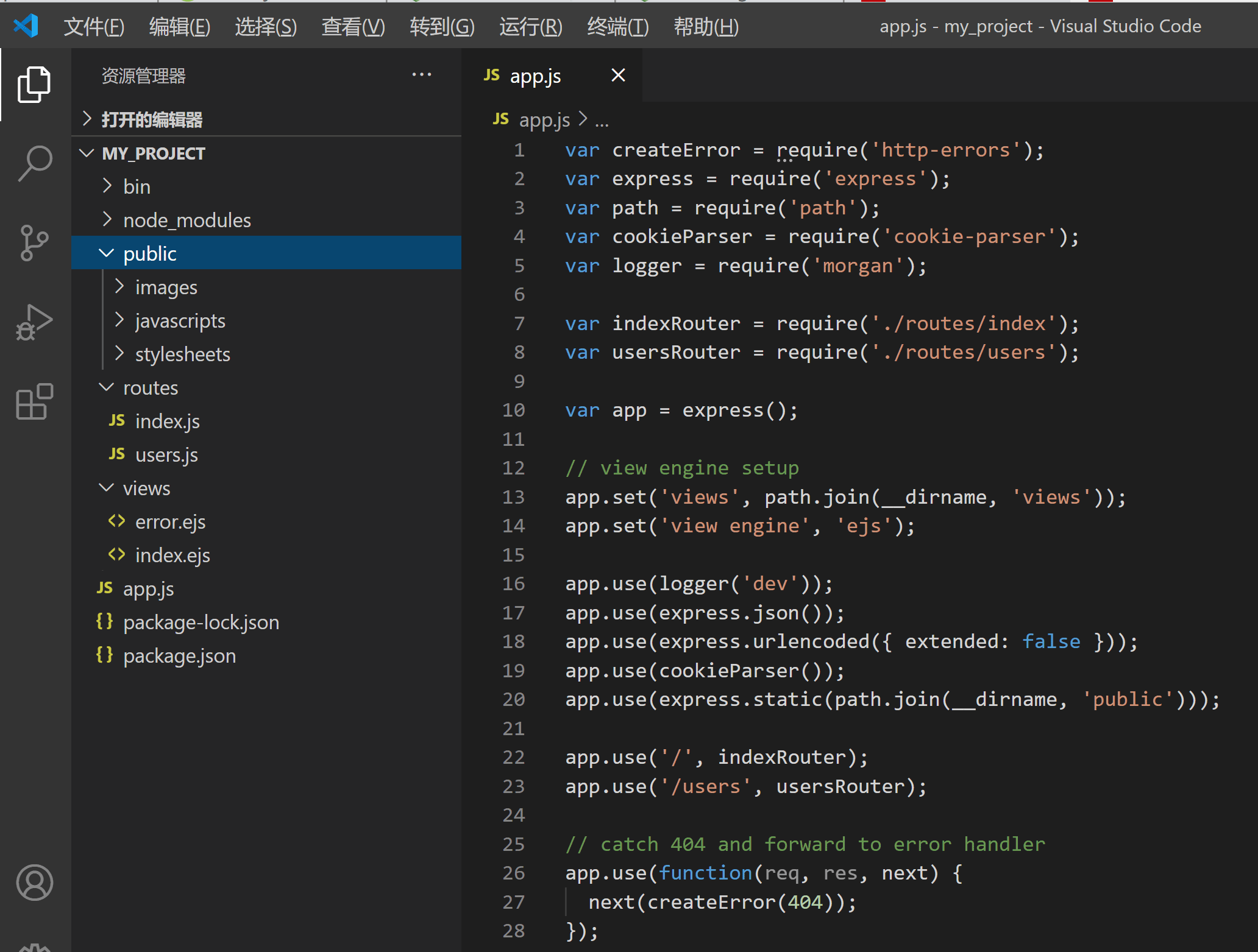# 注釋:進入到桌面,并創建名為my_project的目錄cd Desktopmkdir my_project# 注釋:輸入以下命令,生成Express項目 我一般默認使用ejs使用服務端模板引擎(以后討論)npx express-generator --view ejs