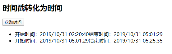 import React from "react";import axios from "axios";import moment from "moment";class Time extends React.Component { //構(gòu)造函數(shù) constructor() { super(); //react定義數(shù)據(jù) this.state = { list: [] } } //請(qǐng)求接口的方法 getData = () => { var api = "http://localhost:3004/users"; axios.get(api) .then((response) => {// handle successconsole.log(response.data);//用到this需要注意指向,箭頭函數(shù)this.setState({ list: response.data}) }) .catch(function (error) {// handle errorconsole.log(error); }); } render() { return ( <div><h2>時(shí)間戳轉(zhuǎn)化為時(shí)間</h2><button onClick={this.getData}>獲取時(shí)間</button><ul> { this.state.list.map((value, key) => { let start = moment(parseInt(value.startTime)).format("YYYY/MM/DD hh:mm:ss"); let end = moment(parseInt(value.endTime)).format("YYYY/MM/DD hh:mm:ss"); return (<li key={key}> <span>開(kāi)始時(shí)間:{start}</span> <span>結(jié)束時(shí)間:{end}</span></li> ) }) }</ul> </div> ) }}export default Time;5:效果