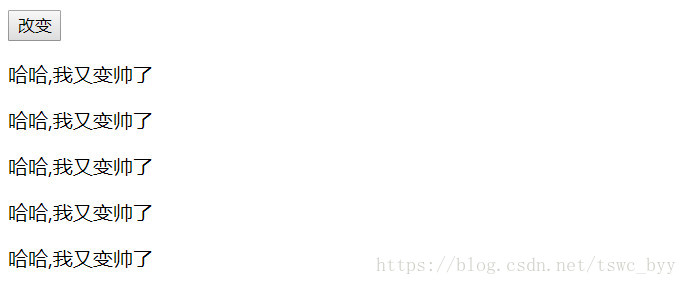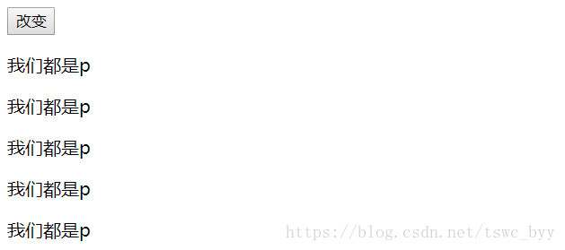 <body><input type="button" value="改變" id="btn"><div id="dv"> <p>哈哈,我又變帥了</p> <p>哈哈,我又變帥了</p> <p>哈哈,我又變帥了</p> <p>哈哈,我又變帥了</p> <p>哈哈,我又變帥了</p></div><script> //根據id獲取按鈕,注冊點擊事件,添加事件處理函數 document.getElementById("btn").onclick = function () {//根據標簽名字獲取標簽var pObjs = document.getElementsByTagName("p");//var pObjs=document.getElementById("dv1").getElementsByTagName("p");//循環遍歷這個數組for (var i = 0; i < pObjs.length; i++) { //每個p標簽,設置文字 pObjs[i].innerText = "我們都是p";} };</script></body>