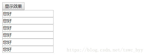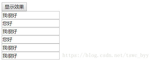 <body><input type="button" value="顯示效果" id="btn"/><br/><input type="text" value="您好" name="name1"/><br/><input type="text" value="您好" name="name2"/><br/><input type="text" value="您好" name="name1"/><br/><input type="text" value="您好" name="name3"/><br/><input type="text" value="您好" name="name1"/><br/><input type="text" value="您好" name="name1"/><br/><script> //點擊按鈕,改變所有name屬性值為name1的文本框中的value屬性值 document.getElementById("btn").onclick = function () {//通過name屬性值獲取元素-------表單的標簽var inputs = document.getElementsByName("name1");for (var i = 0; i < inputs.length; i++) { inputs[i].value = "我很好";} };</script></body>