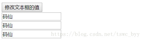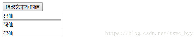 <body><input type="button" value="修改文本框的值" id="btn"/><br/><input type="text" value=""/><br/><input type="text" value=""/><br/><input type="text" value=""/><script> //根據id獲取按鈕,為按鈕注冊點擊事件,添加事件處理函數 document.getElementById("btn").onclick = function () {//獲取所有的文本框//根據類樣式的名字獲取元素var inputs = document.getElementsByClassName("text");for (var i = 0; i < inputs.length; i++) { inputs[i].value = "碼仙";} };</script></body>