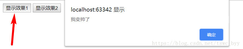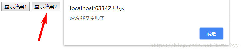 <body><input type="button" value="顯示效果1" id="btn"/><input type="button" value="顯示效果2"/><script> //點擊按鈕彈出對話框 //根據選擇器的方式獲取元素 var btnObj1 = document.querySelector("#btn"); btnObj1.onclick = function () {alert("我變帥了"); }; var btnObj2 = document.querySelector(".btn"); btnObj2.onclick = function () {alert("哈哈,我又變帥了"); };</script></body>