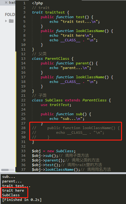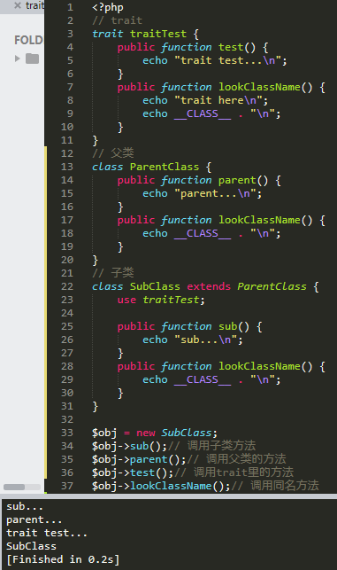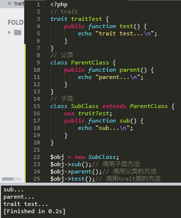 // traittrait traitTest { public function test() {echo "trait test...\n"; }}// 父類class ParentClass { public function parent() {echo "parent...\n"; }}// 子類class SubClass extends ParentClass { use traitTest; public function sub() {echo "sub...\n"; }}$obj = new SubClass;$obj->sub();// 調(diào)用子類方法$obj->parent();// 調(diào)用父類的方法$obj->test();// 調(diào)用trait里的方法代碼和結(jié)果截圖: