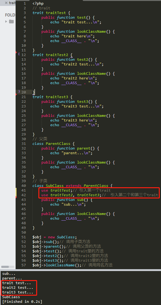 上邊的這個(gè)例子,子類直接extentds父類,然后又在類內(nèi)use了trait。這樣當(dāng)前類(子類)就擁有了這三個(gè)的全部方法。