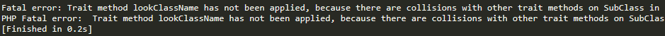 當(dāng)子類沒有(注釋或者刪除)lookClassName()方法時(shí),調(diào)用lookClassName方法,則會(huì)調(diào)用trait中的方法,因?yàn)槿齻€(gè)trait中都有同名方法,此時(shí)就會(huì)發(fā)生致命錯(cuò)誤(沖突)。
