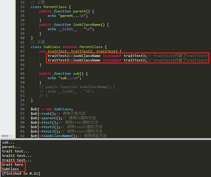 因此,最終輸出結(jié)果時(shí),調(diào)用lookClassName(),輸出的就是traitTest3的內(nèi)容(輸出結(jié)果看上邊最近的“代碼和結(jié)果截圖”)。
