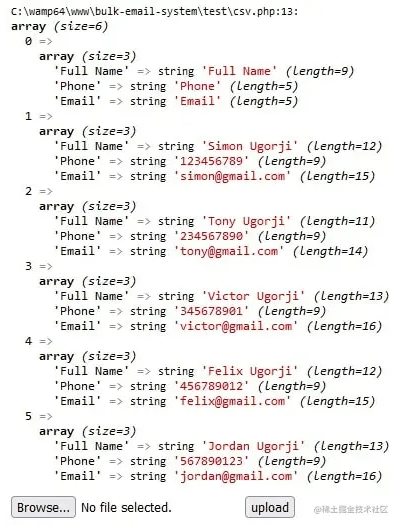 if($_SERVER["REQUEST_METHOD"] == "POST"){ $file = "./my_csv_file.csv"; //loop through the csv file into an array $csvData = readCSV($file); //create array to store the new data $newData = []; //loop through headers and then add values as a new array foreach($csvData["headers"] as $index => $key){if($key == "Full Name"){ $newData[$key] = $_POST["full_name"];}elseif($key == "Email"){ $newData[$key] = $_POST["email"];}elseif($key == "Phone"){ $newData[$key] = $_POST["phone"];}else{ $newData[$key] = "";} } var_dump($newData);}如圖所示就是我們將寫入到 CSV 文件的數組的數據